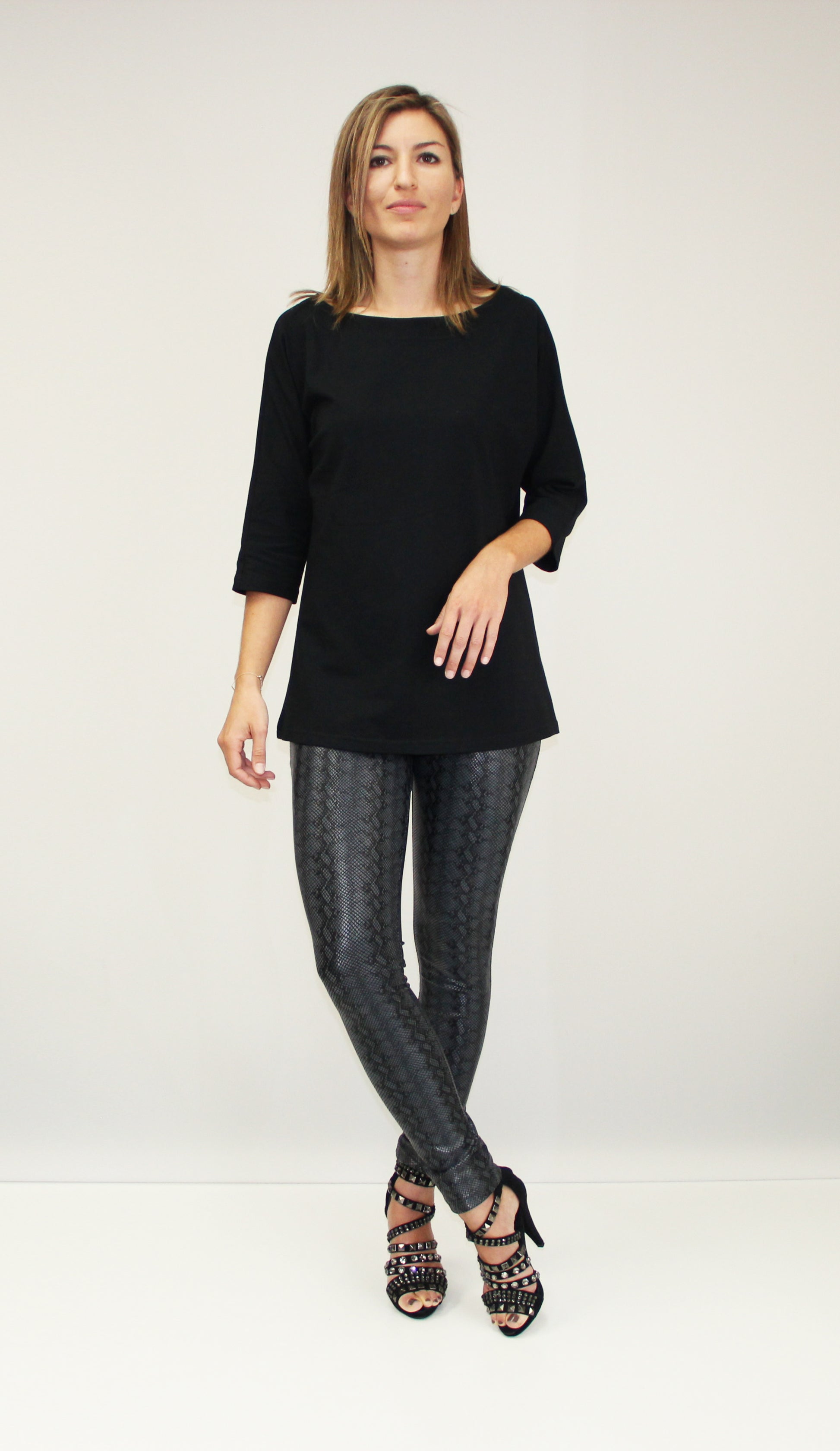 Designed for a comfortable fit and coverage along the hip, the Black Dolman Tunic features a boat-neck and three-quarter sleeves. This top is finished with top stitching details at the neckline, hem, and sleeve hems.